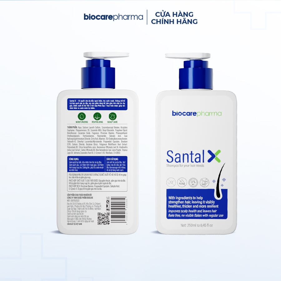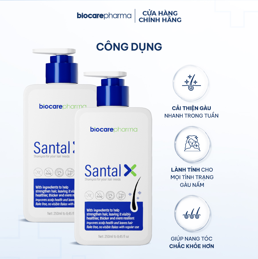 Santal X là dầu gội trị gàu phiên bản nâng cấp của Biocare Pharma. Sản phẩm với Phức hợp thảo mộc tiên tiến và 2% Piroctone Olamine cùng các thành phần khác giúp X2 hiệu quả. Hiện nay, gàu nấm da đầu là tình trạng khá phổ biến và việc loại bỏ không hề dễ dàng. Tuy nhiên, với combo 2 chai dầu gội Santal X Shampoo Biocare Pharma giúp trị gàu nấm nhẹ hiệu quả.
