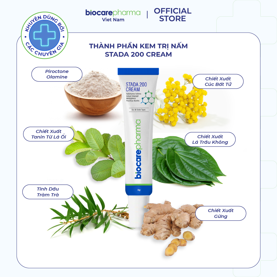 Trong đó, Stada 200 Cream là kem trị nấm da đầu hiệu quả. Sản phẩm có tác dụng trị nấm ngứa, mụn da đầu hiệu quả nhanh chóng. Các tinh chất trong sản phẩm giúp làm khô se bề mặt tổn thương trên da đầu. Đồng thời, nuôi dưỡng chân tóc chắc khỏe hơn sau khi sử dụng.