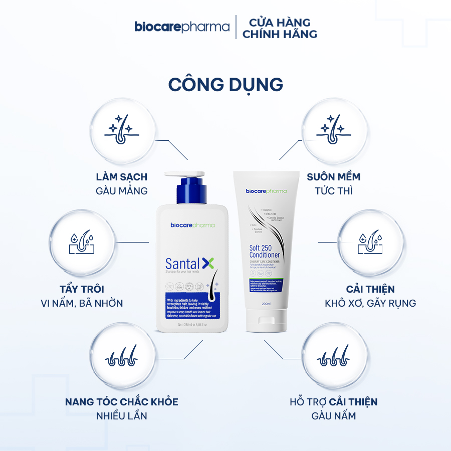 Công dụng của bộ đôi gàu nấm Santal X và Soft 250 Biocare Pharma
