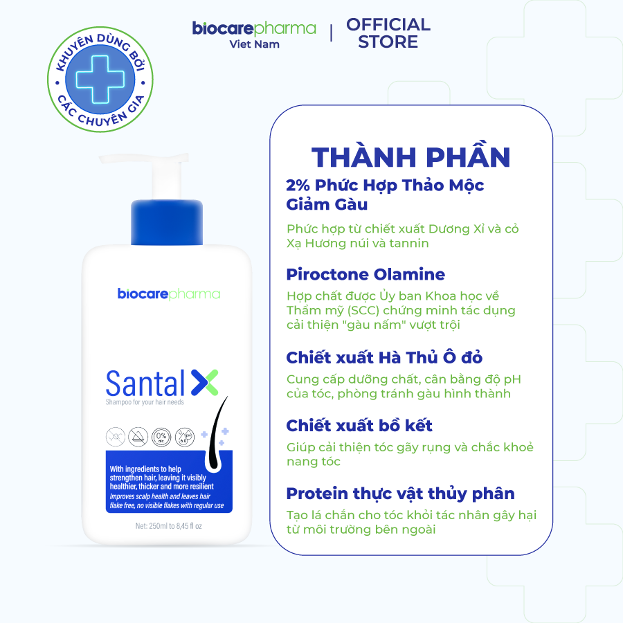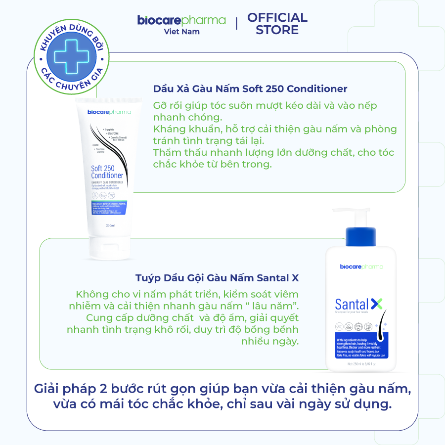 Trong đó, dầu gội Santal X là phiên bản nâng cấp thế hệ mới của Biocare Pharma. Sản phẩm bổ sung phức hợp thảo mộc tự nhiên giúp trị gàu nấm gấp 2 lần. Kết hợp cùng dầu xả gàu nấm Soft 250 phục hồi tóc hư tổn hiệu quả. Đặc biệt, dầu xả Soft 250 khắc phục tình trạng tóc khô xơ hiệu quả với những mái tóc khô do dùng dầu gội trị gàu. Kết hợp Santal X và Soft 250 là bộ đôi hoàn hảo loại sạch gàu nấm và phục hồi tóc khô xơ, hư tổn.
