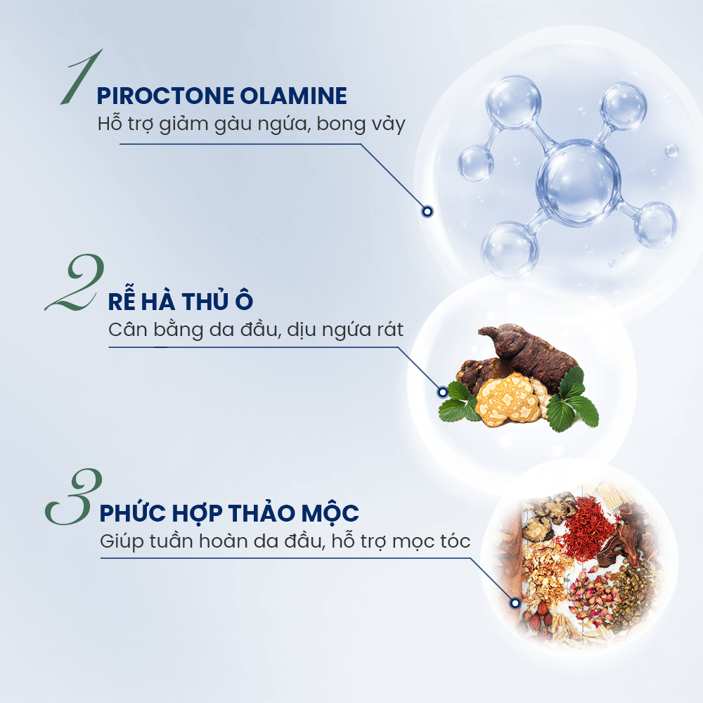 Dầu gội gàu ngứa tích hợp cả 2 Hoạt Chất Hỗ Trợ Cải Thiện Gàu Ngứa Và Các Phức Hợp Thảo Mộc, cải thiện tình trạng gàu ngứa nhưng không làm tóc khô xơ, giúp da đầu khoẻ hơn và tóc mọc dài và suôn mượt hơn.