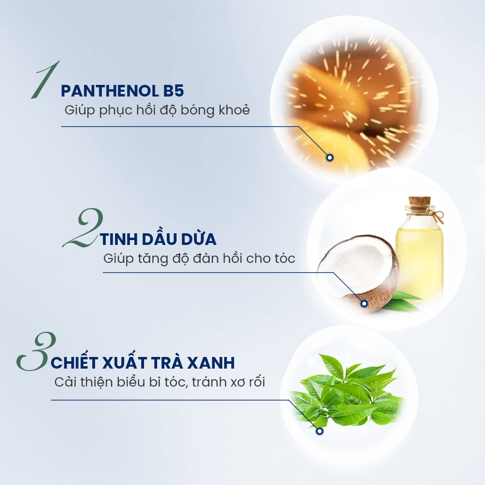 – Chiết xuất từ trà xanh: Cung cấp chất chống oxy hóa mạnh mẽ, bảo vệ cấu trúc tóc khỏi các tác nhân từ môi trường.