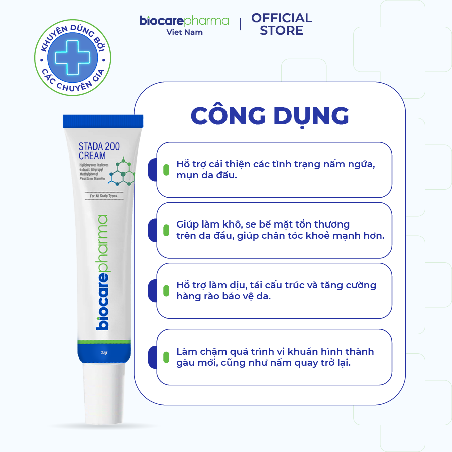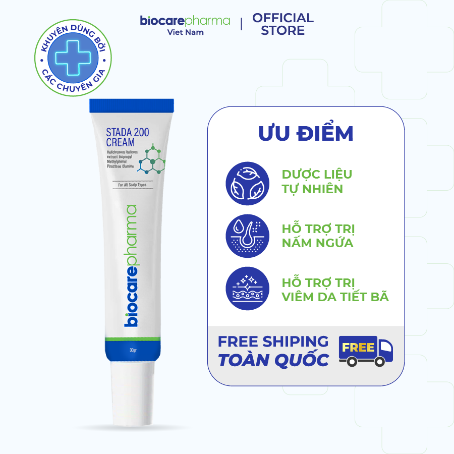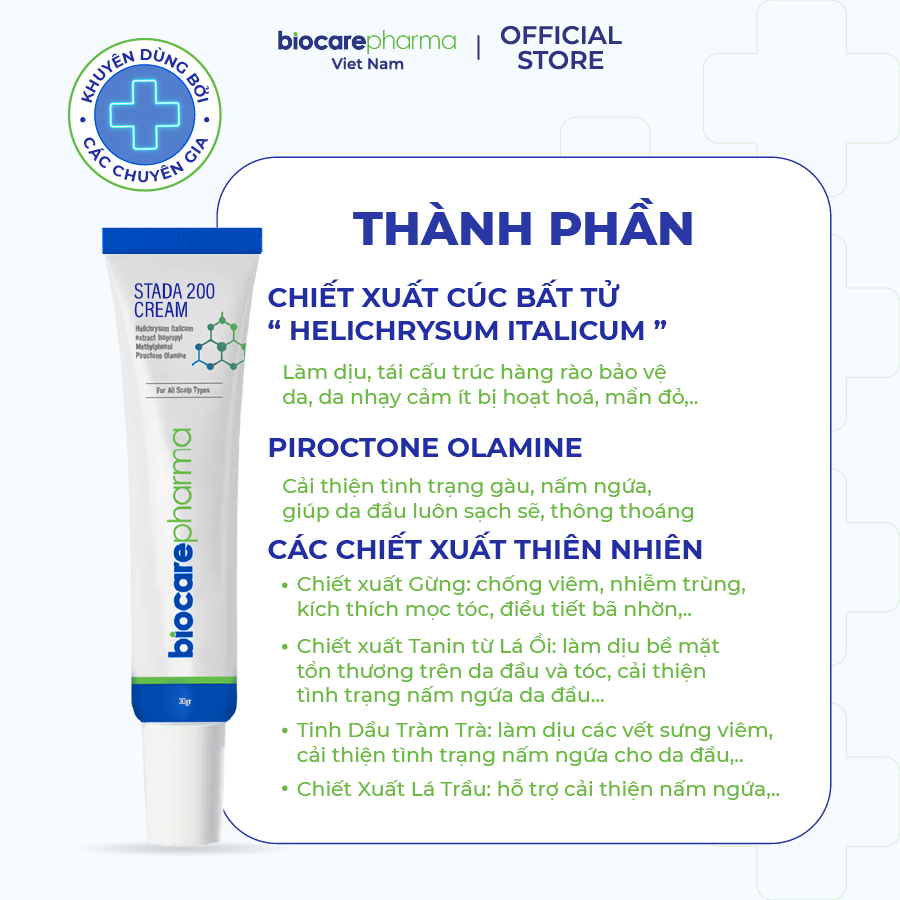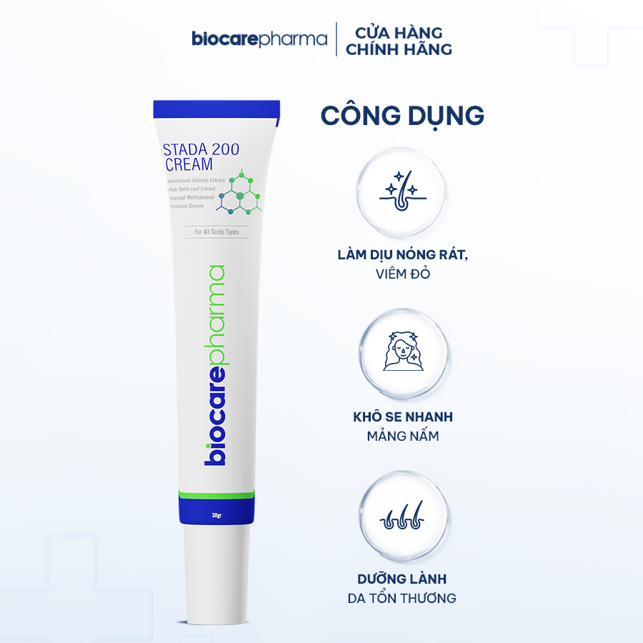 Ngứa, gàu, rụng tóc… là tình trạng người bị nấm da đầu gặp phải khiến họ cảm thấy khó chịu. Kèm theo đó là cảm giác e ngại, mất tự tin trong giao tiếp. Stada 200 Cream dòng kem trị nấm da đầu được chiết xuất từ thảo dược tự nhiên giúp loại bỏ hoàn toàn nấm ngứa. Đây là sản phẩm của Công ty BioCare Pharma được sản xuất bởi công nghệ “độc quyền”. Qua đó, giúp ngăn ngừa nấm da đầu và giúp chân tóc chắc khỏe.