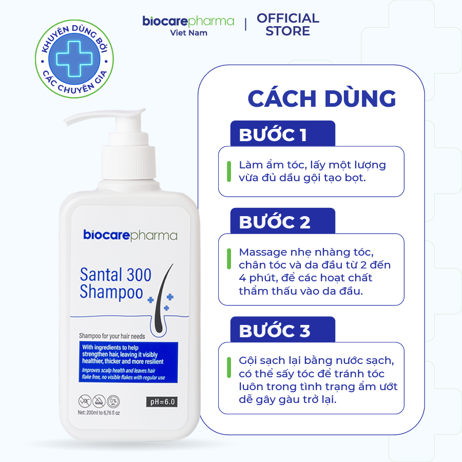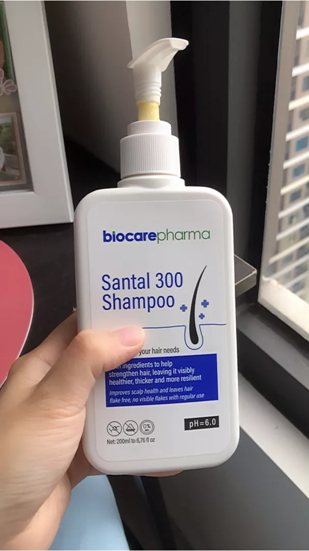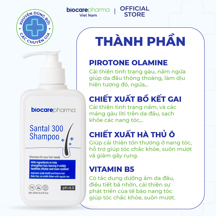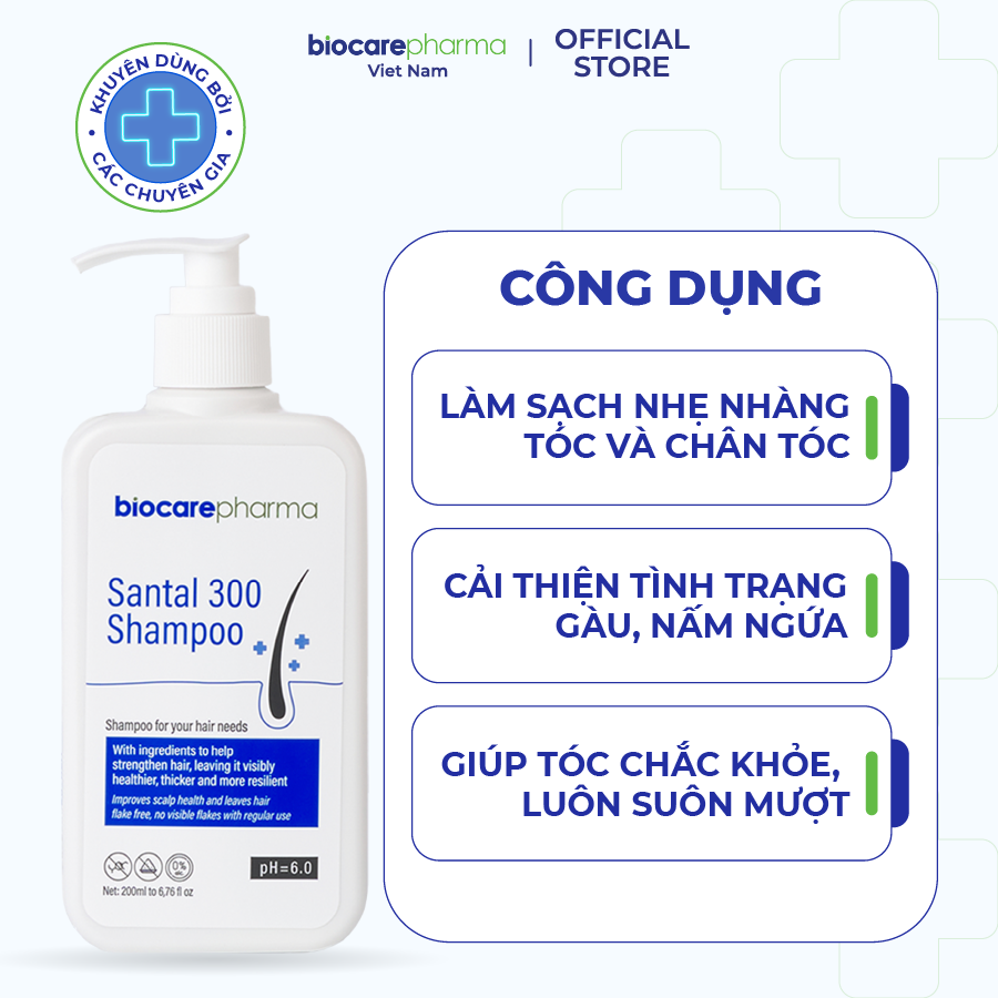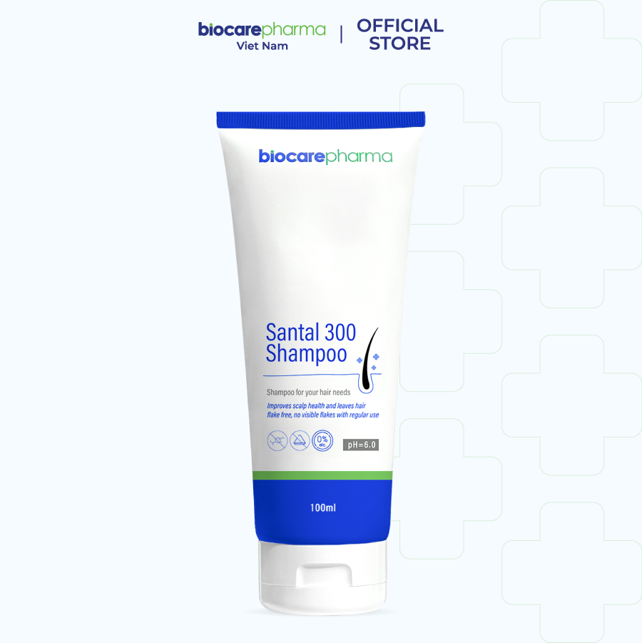 Đây là dòng sản phẩm trị gàu nấm cao cấp của Biocare Pharma. Santal 300 Shampoo có tác dụng loại bỏ gàu, ngứa và nấm da đầu hiệu quả. Dưới đây là các thành phần chính tạo nên sản phẩm trị gàu tuyệt vời này: